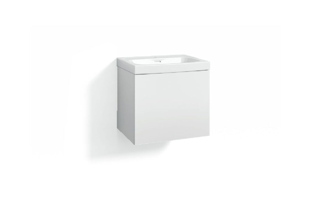 Svedbergs Forma kommod 60×45 art.nr A15620 med djup 50 cm. 1 låda, innerlåda. Vit . Tvättställ Deep art.nr 6060 Bassäng centrum utan blandare. Glaserad porslin.